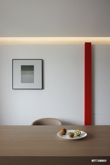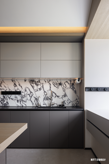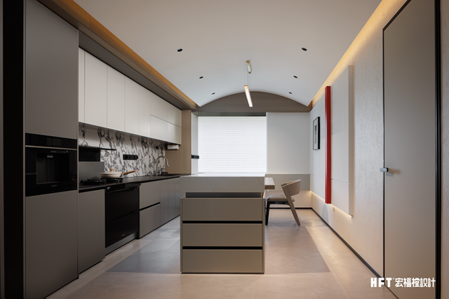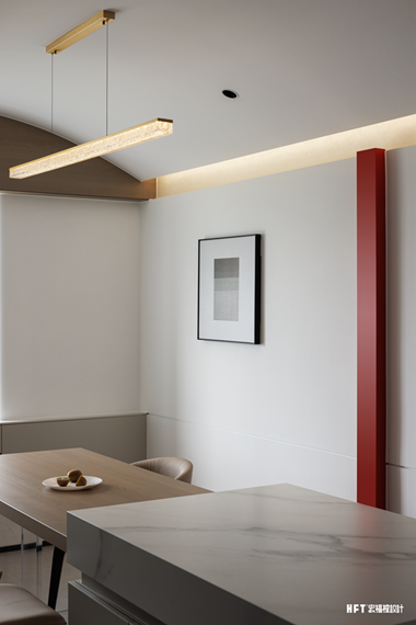 从“经过”到“环绕”的动线设计,增强了生活中孩子玩耍、探索的趣味性。餐岛一体设计模糊了功能的绝对边界,不仅使烹饪、用餐、休闲、办公、聚餐等行为自然交融,也让亲子陪伴与情感互动藏于生活每一刻。