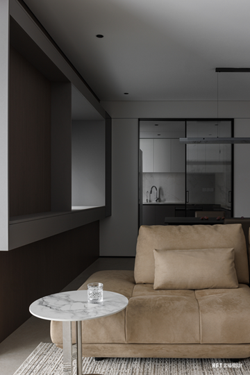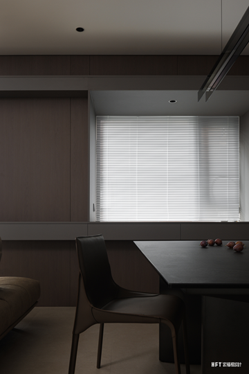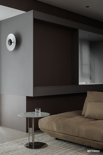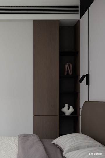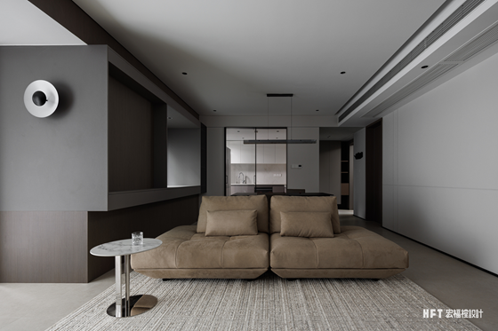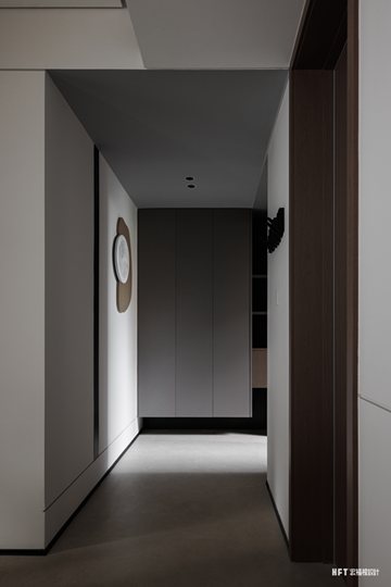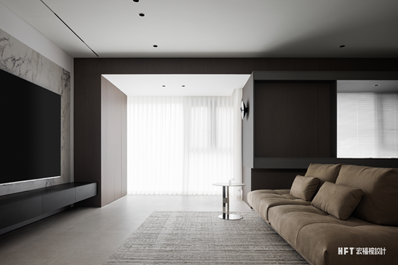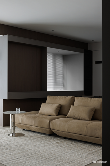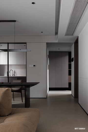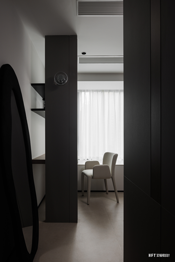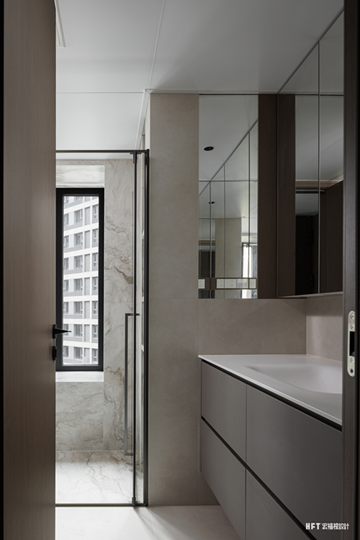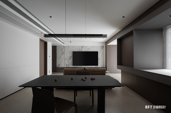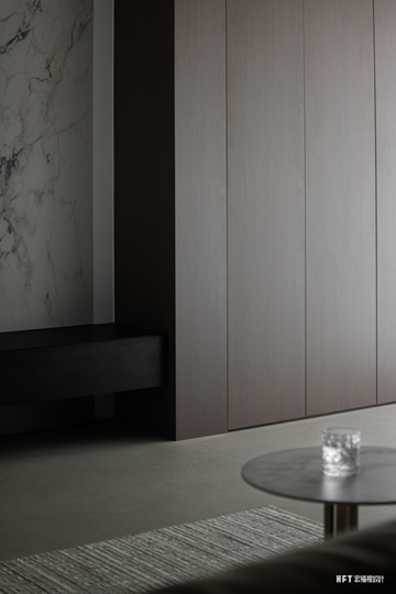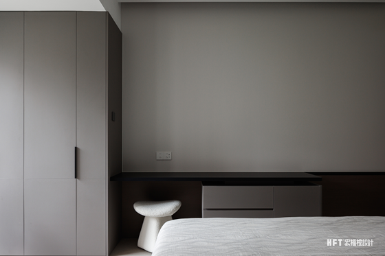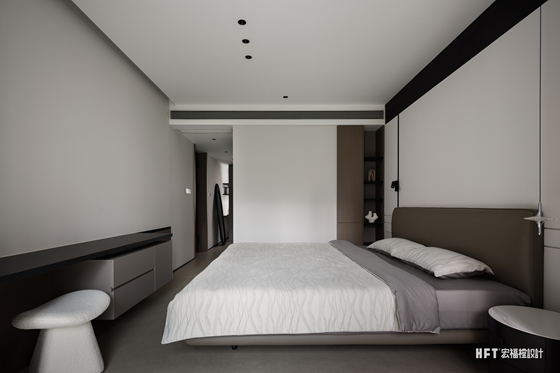 当功能诉求成为空间重塑的起点,设计的笔触便从结构的解构展开。这处IT工程师的居所,原始四室格局被精炼为三间卧室,释放出的一室被纳入主卧体系,不仅成就了独立的收纳衣帽间,更嵌入一隅办公区域,将休憩、储物与工作凝练为私密而流畅的动线。外部琐碎的区域被重新梳理与整合,两侧景观阳台纳入室内,为内部空间延展尺度。材质在此处成为统一的语言,通过延展与包裹,将多元功能悄然消隐于统一的视觉秩序之下。