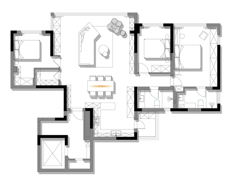 原始户型为135㎡四室两厅,空间规划较为零碎,主要使用的公共空间面积不够宽敞。夫妻希望在保留三间卧室的格局下,能最大限度的开放空间,让空间更宽敞明朗,并且最大限度的增加储藏收纳设备。