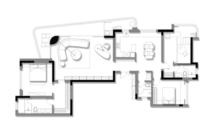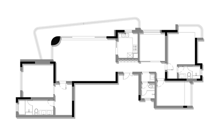 1.厨房与紧邻卧室合并后释放,重组为开放式+餐厅一体格局