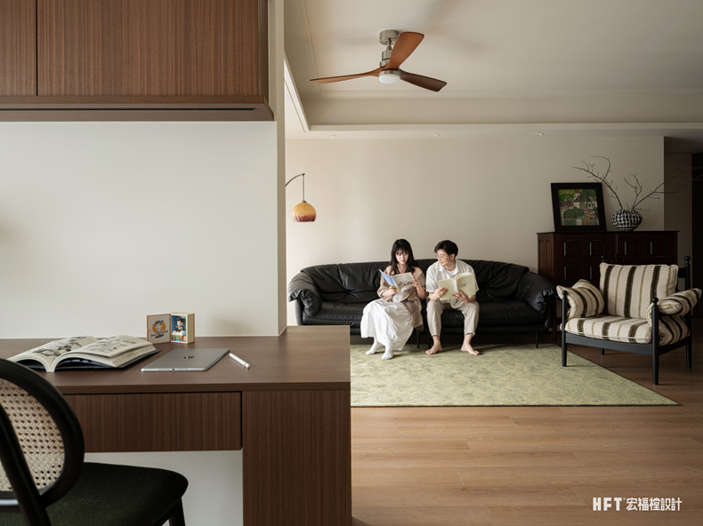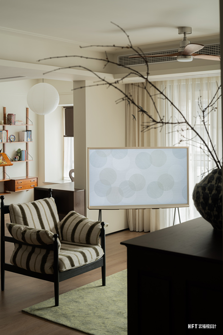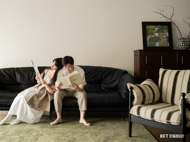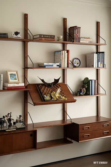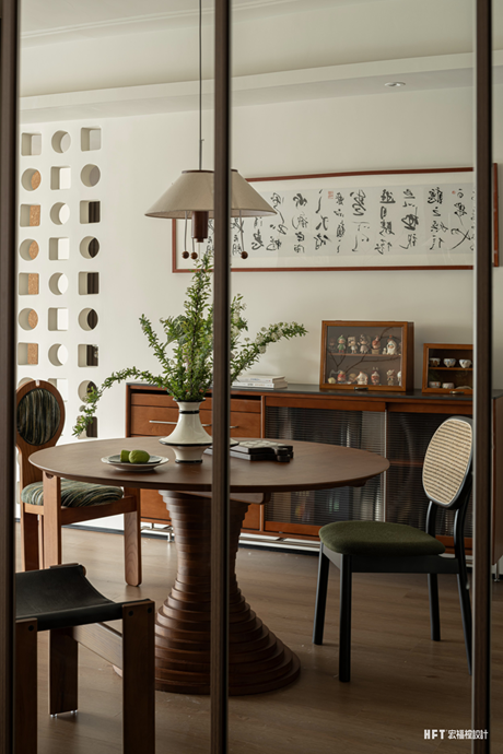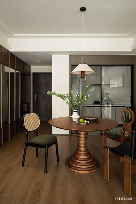 精装房改造,以中古混搭为风格基调。打破传统格局束缚,将公区重塑为开放流动的互动场域。两人一猫的静谧生活被赋予更多可能,错落的功能分区让阅读、办公或慵懒各得其所,而通透的视野与穿插的家具布局,则巧妙维系着彼此的目光连结。