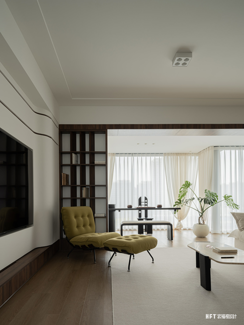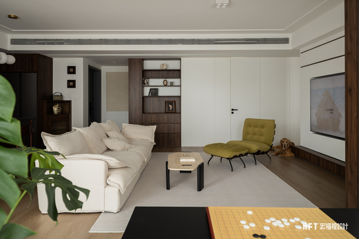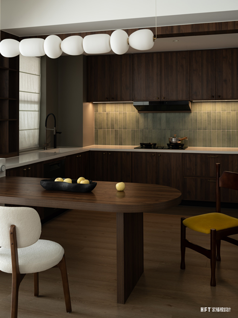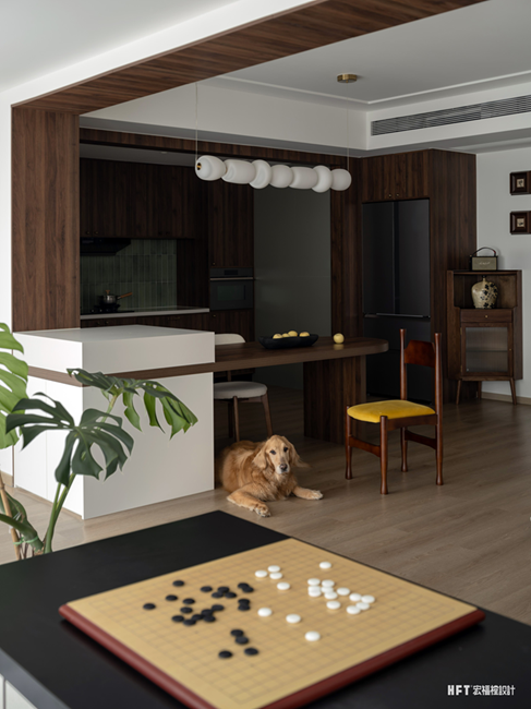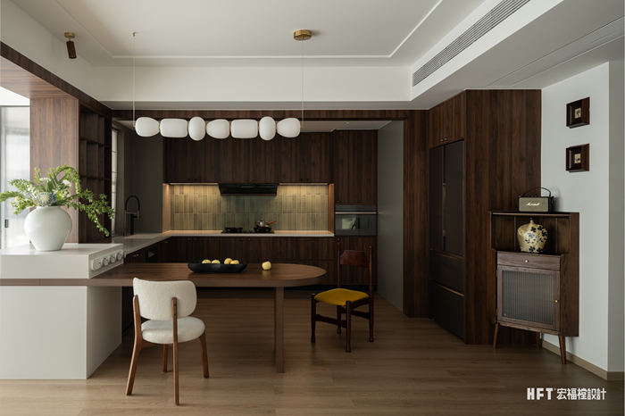 在精装房的标准化框架上进行个性化设计。以整面复合型柜体串联客餐厅,深胡桃木与经典黑的复古基调,搭配奶白色的温柔过渡,在沉稳与轻盈间找到完美平衡。不仅重塑空间秩序,更在原始呆板布局中实现功能与品味的双重升级。