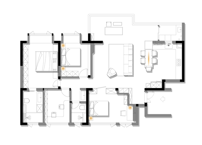 1. 景观阳台纳入,扩大客厅面积的同时将一部分独立为家政空间