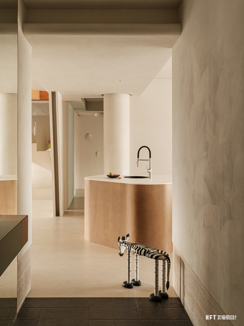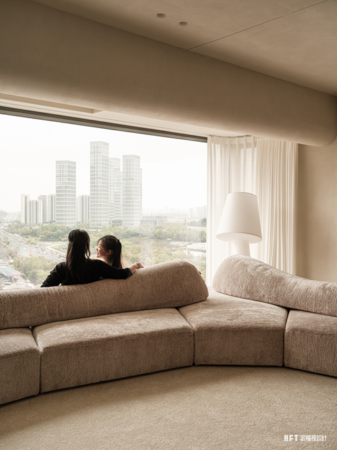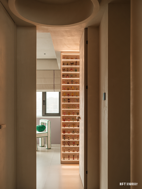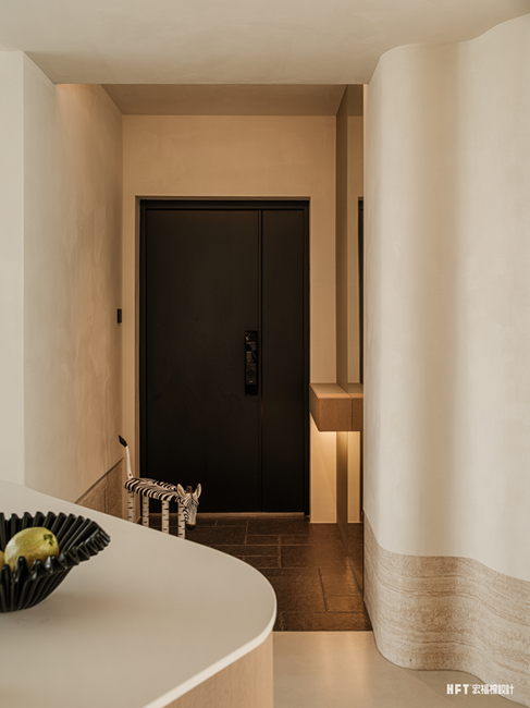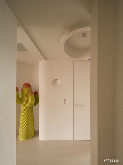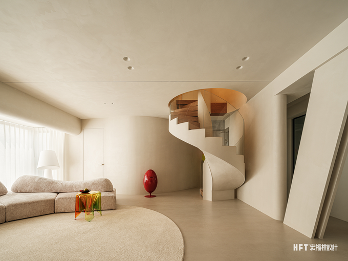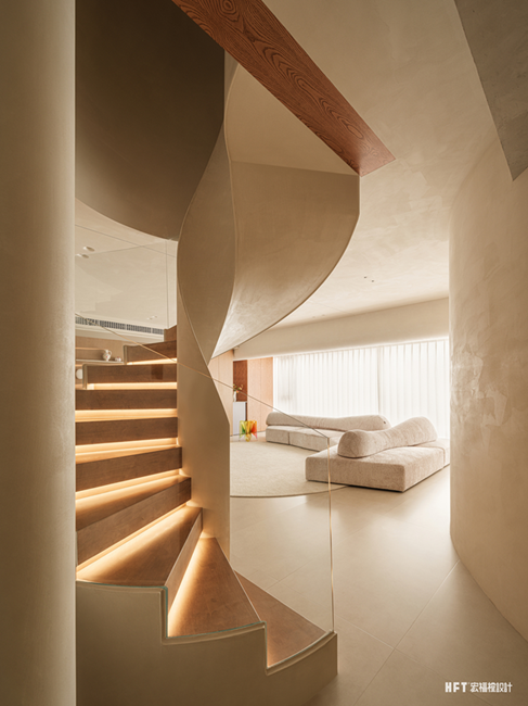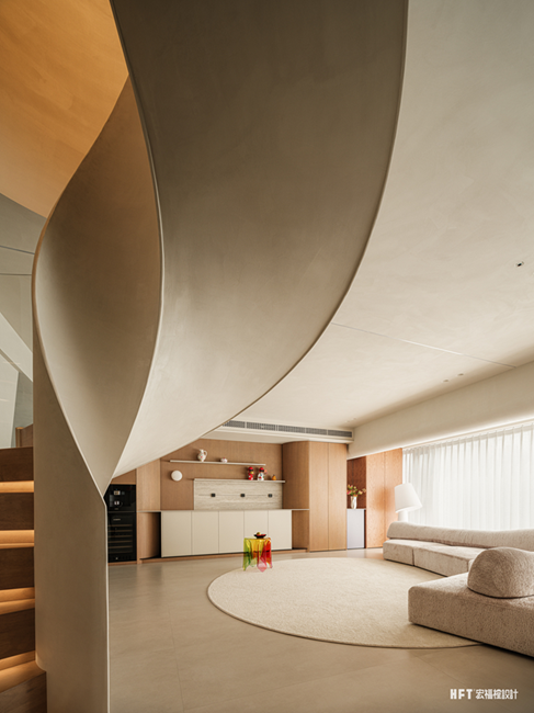 4. 更换父母卧室动线,扩大楼梯走廊空间,同时设计弧形墙体,形成客厅美学端景