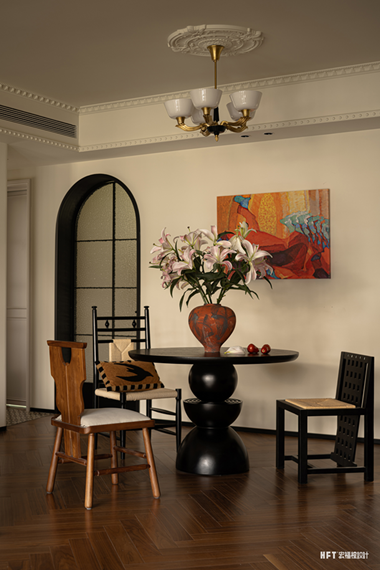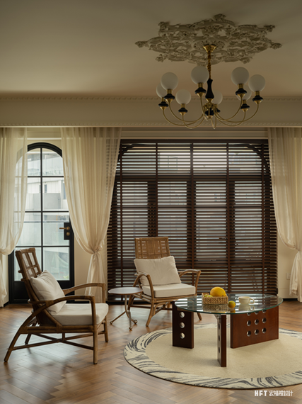 南洋风韵与复古精致悄然相遇,空间便开启了一场质感对话。棕绿系为基调,藤编以天然纹理勾勒出松弛氛围,实木借人字拼接地板与复古家具沉淀温润底蕴。艺术玻璃轻隔区域却不失通透,为日常注入朦胧仪式感。而皮革与金属的细腻点缀,则让时光的厚重与当代的轻盈达成微妙平衡,最终营造出复古而不失灵动、摩登却充满温度的生活场景。