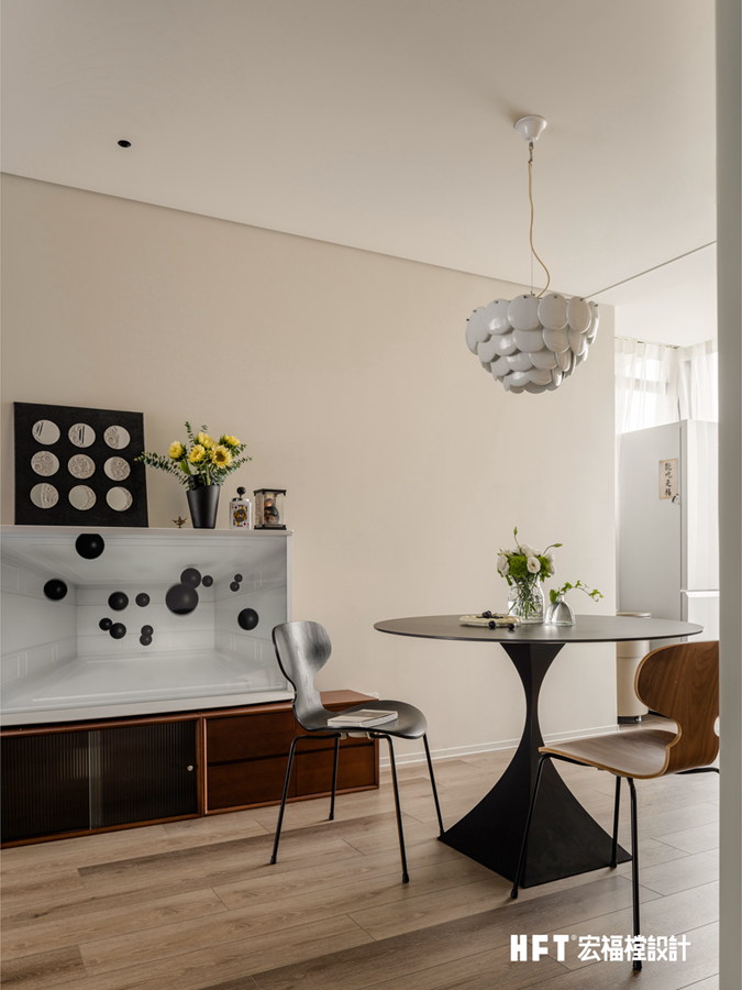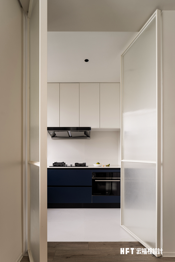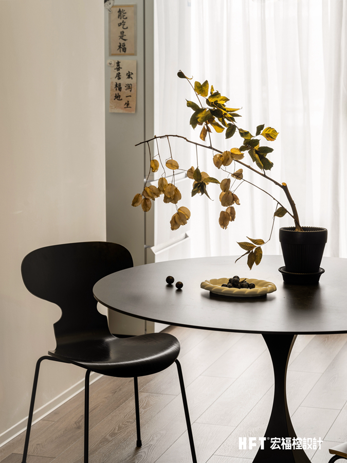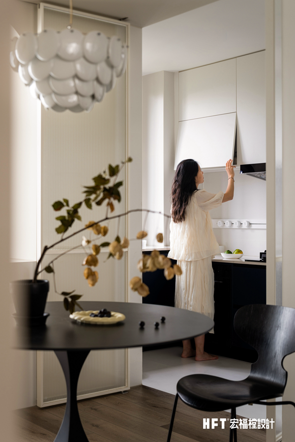 ➋ 餐厅与生活阳台合并使用,扩充面积、储物设备空间的同时,优化与厨房之间的互动关系