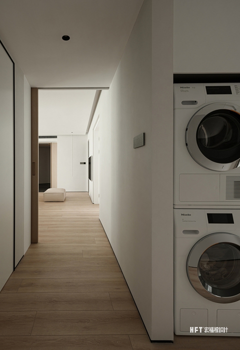 ❺ 重新调整公共次卫格局,释放一部分面积充裕走廊,并增加洗衣收纳柜
