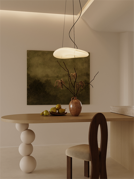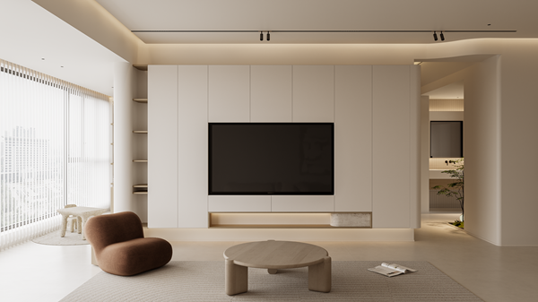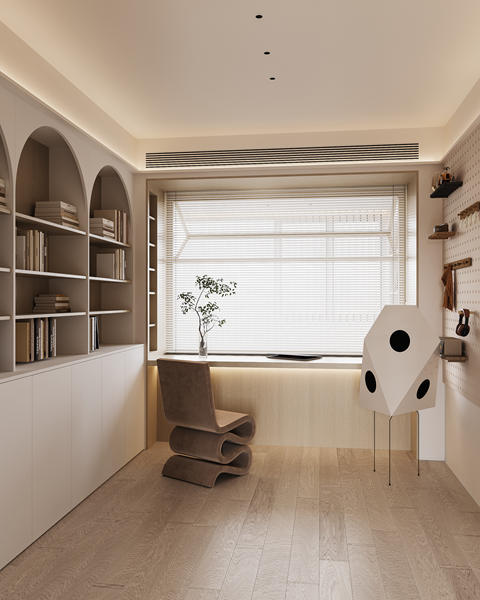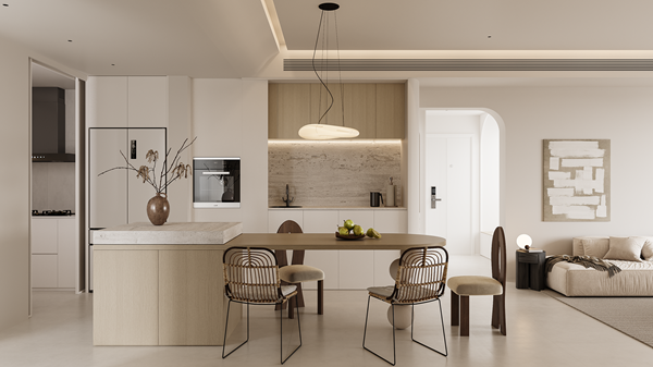 先从空间着手,构建舒适家的基本形态。去拆解、变幻,明确空间功能属性之后,赋予其新的含义,可以是容纳、陪伴、互动。原木与奶油色书写家的温暖底色,将弧线的柔软一寸寸镌刻,才将家的模样一一呈现。