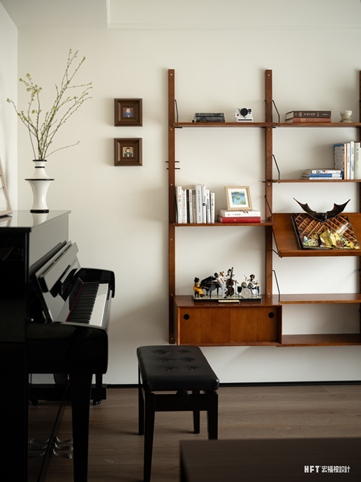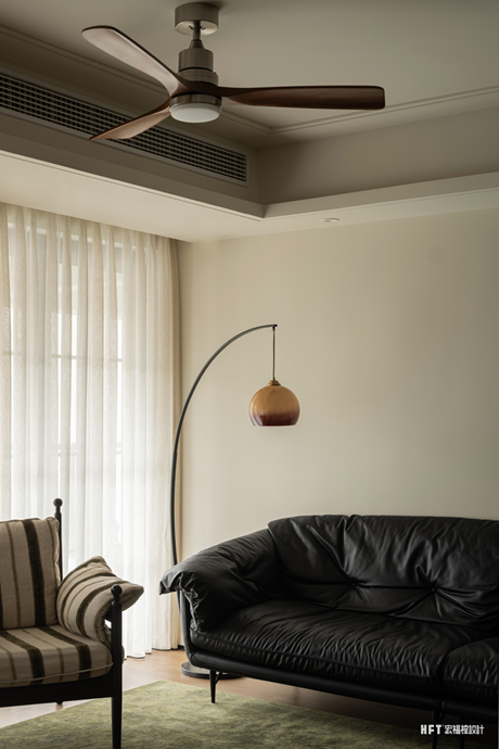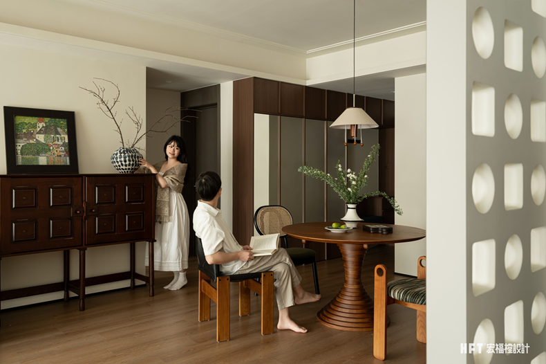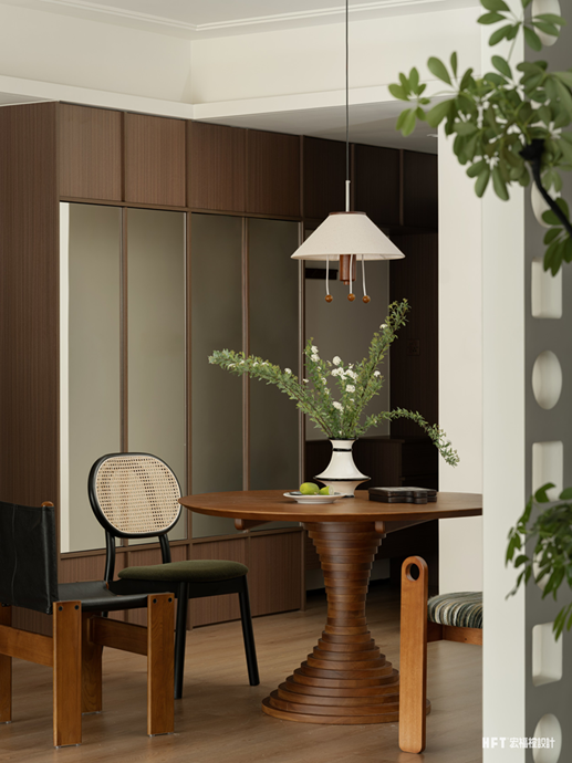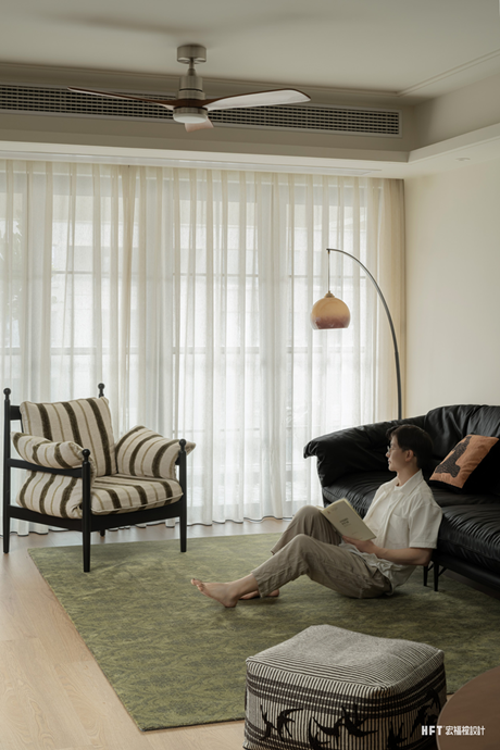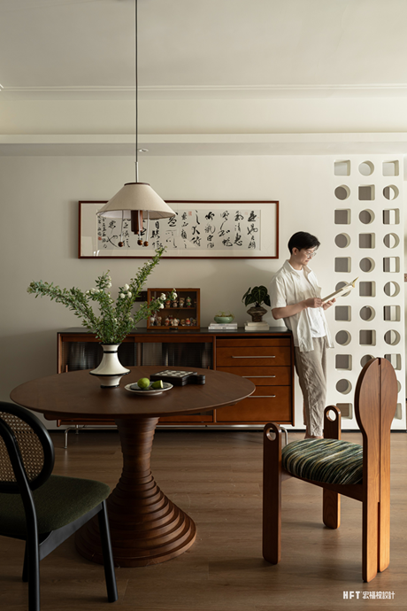 精装房改造,以中古混搭为风格基调。打破传统格局束缚,将公区重塑为开放流动的互动场域。两人一猫的静谧生活被赋予更多可能,错落的功能分区让阅读、办公或慵懒各得其所,而通透的视野与穿插的家具布局,则巧妙维系着彼此的目光连结。