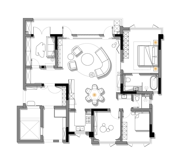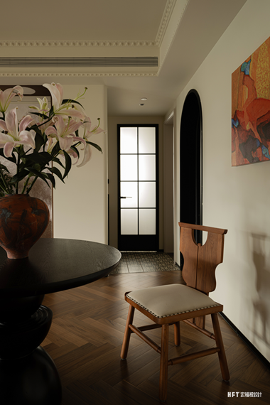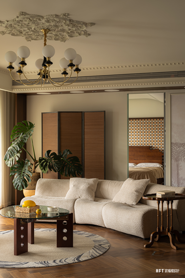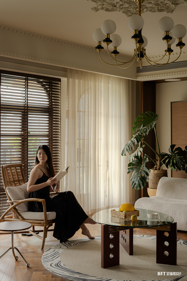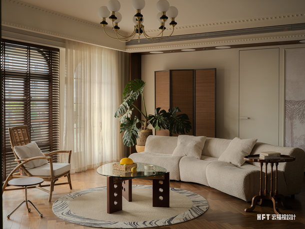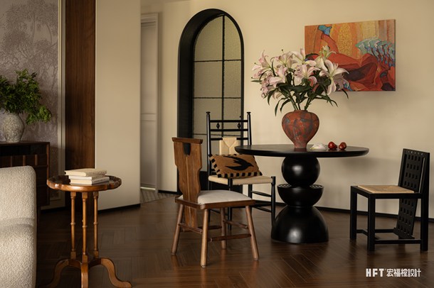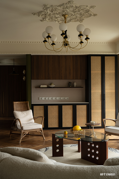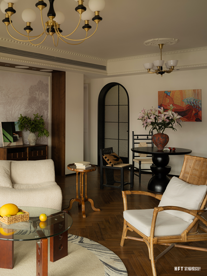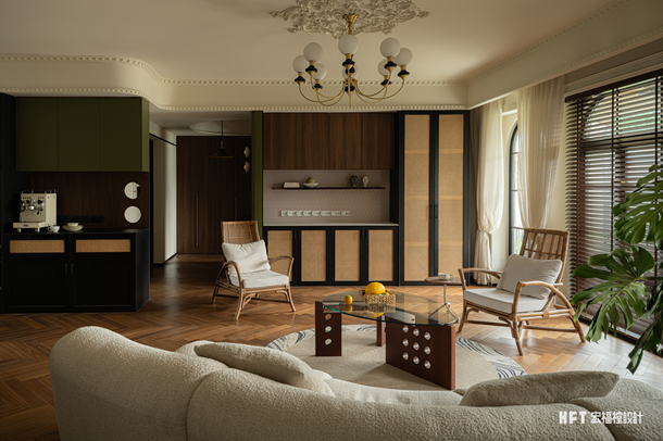 南洋风韵与复古精致悄然相遇,空间便开启了一场质感对话。棕绿系为基调,藤编以天然纹理勾勒出松弛氛围,实木借人字拼接地板与复古家具沉淀温润底蕴。艺术玻璃轻隔区域却不失通透,为日常注入朦胧仪式感。而皮革与金属的细腻点缀,则让时光的厚重与当代的轻盈达成微妙平衡,最终营造出复古而不失灵动、摩登却充满温度的生活场景。